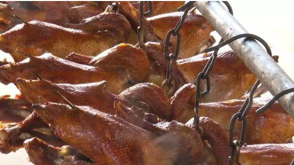 腌制好的鸡,终于要进炉子里烘烤了,长长的铁杆顶端带着小叉子,直接把串好的鸡就挂进了炉内。